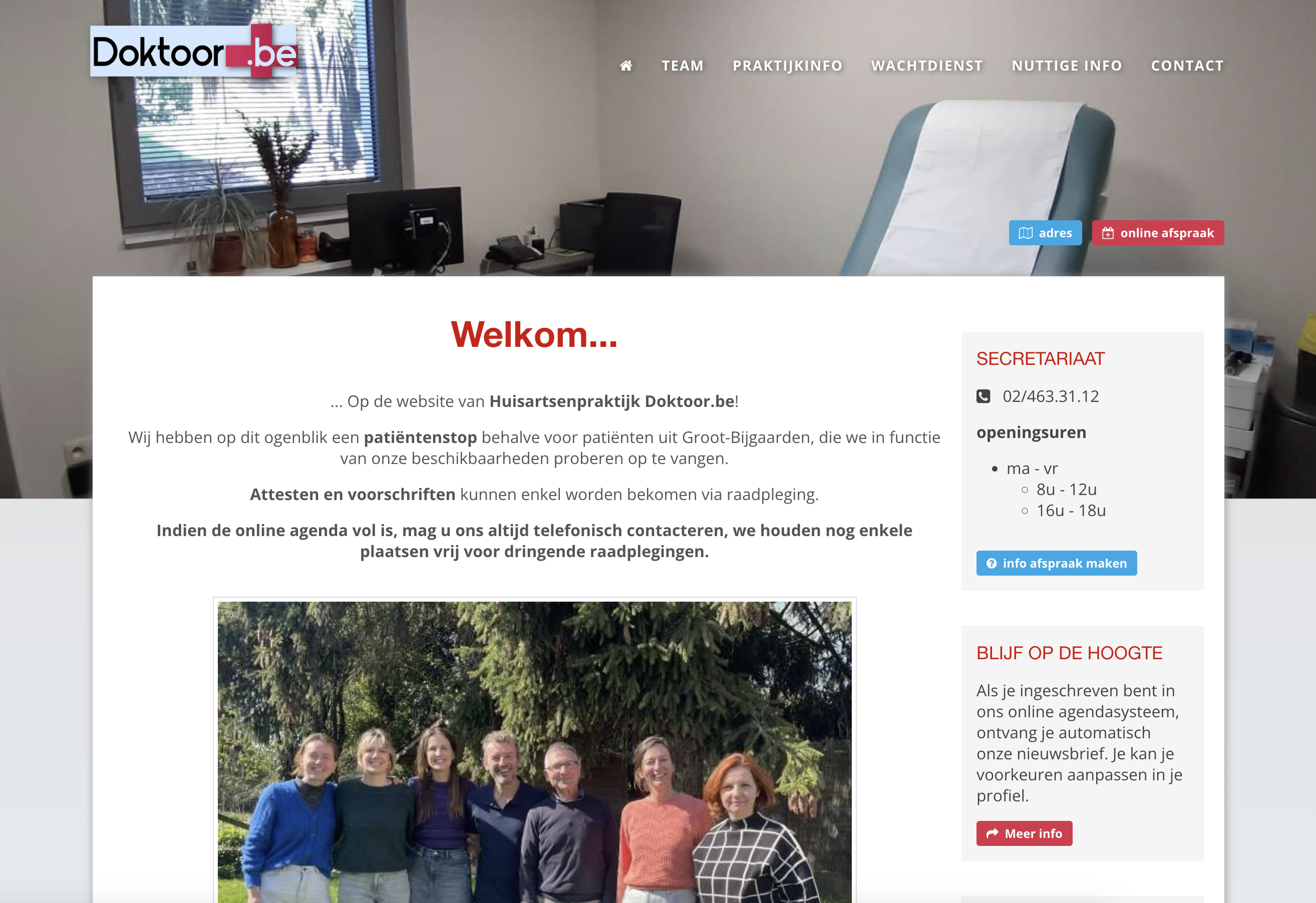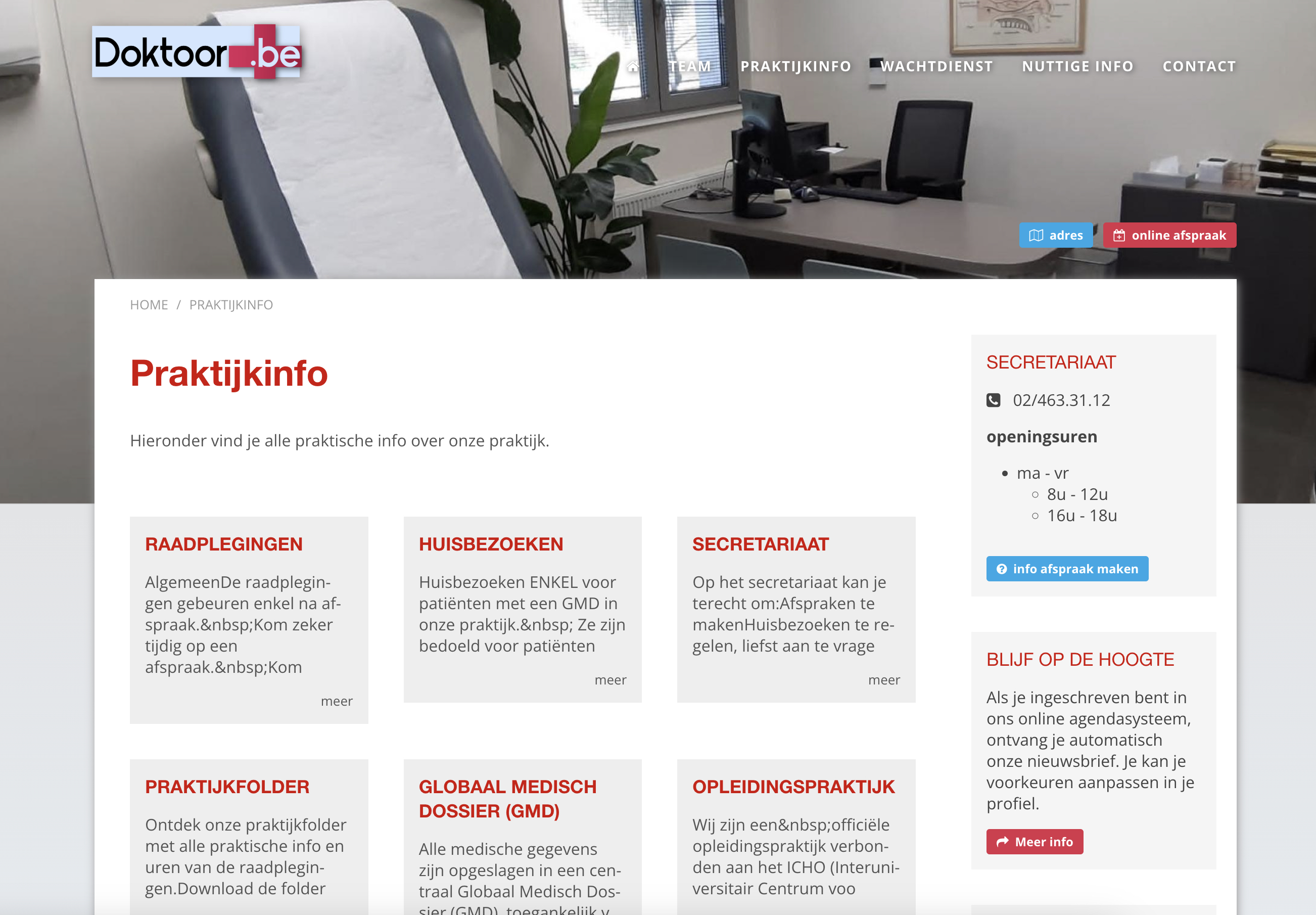 De website biedt duidelijke informatie over de huisartsen, hun specialisaties en hun raadplegingsuren, aangevuld met praktische info over de werking van de praktijk. Dankzij de technische vernieuwing kan doktoor.be deze informatie eenvoudig beheren en up-to-date houden.